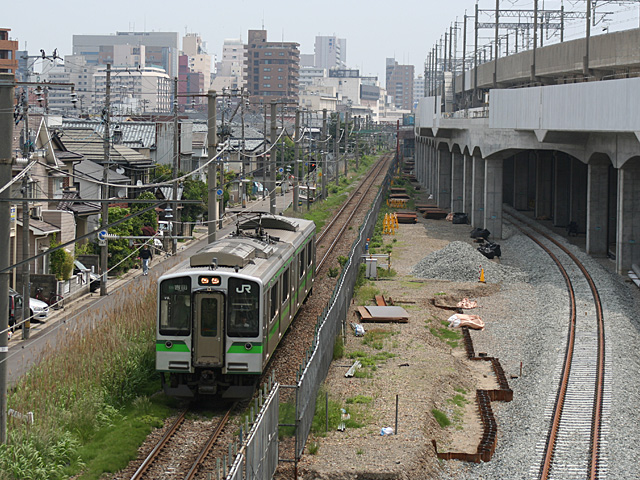 134M 5/25 西跨線橋から新潟方面へ この辺りに、高架線への渡り線が作られるものと思われます。 |