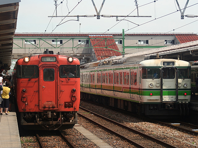 ** 新旧主流列車 | 右の電車は およそ1時間後に発車する柏崎行です。
