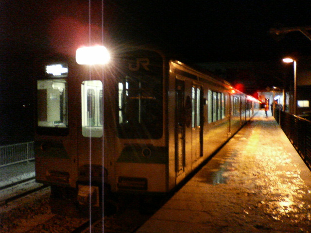 ** 寒い | 一番列車の到着まで時間があったので あちこちウォッチングをしてみることにします。 くす玉やテープの部分が思い切りブレていますが それくらい風が強かったんです。(^_^;